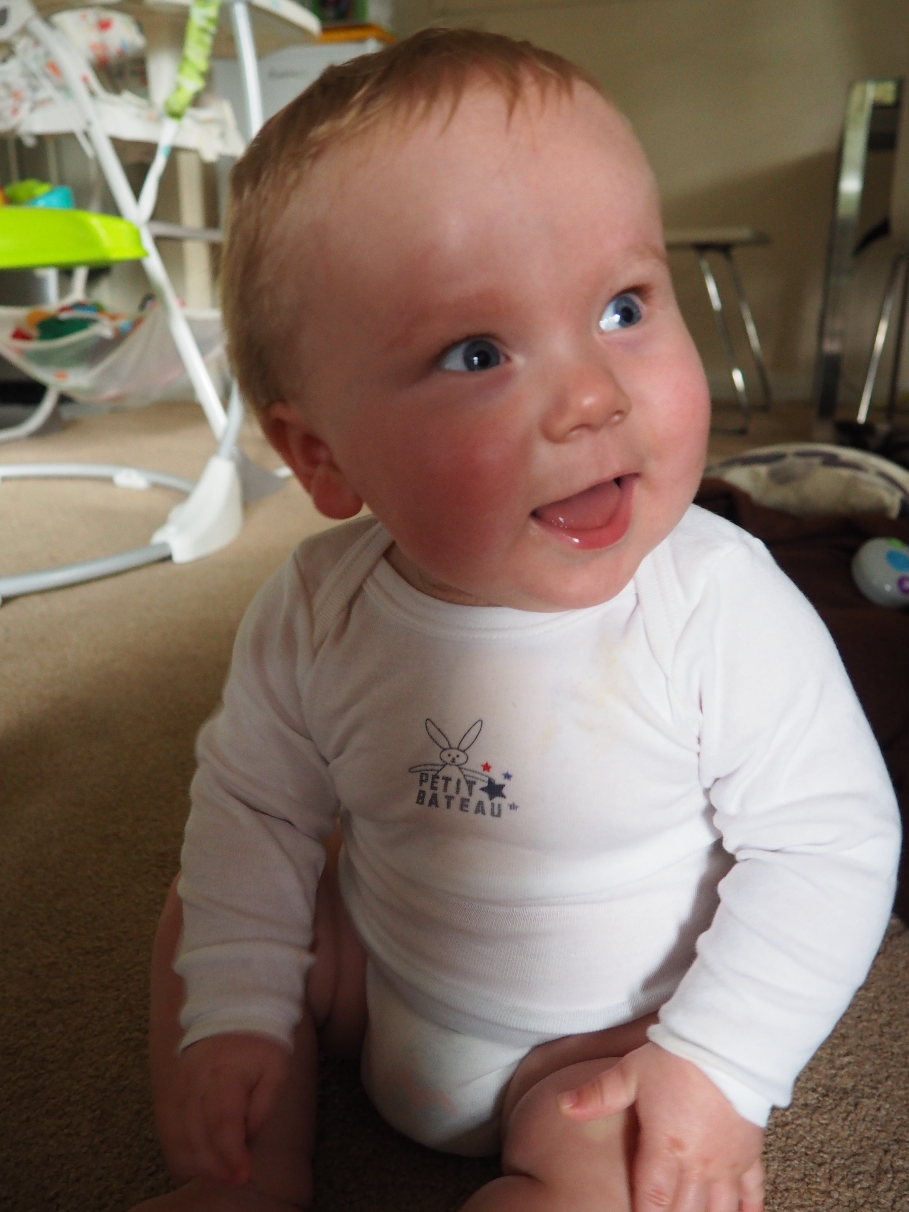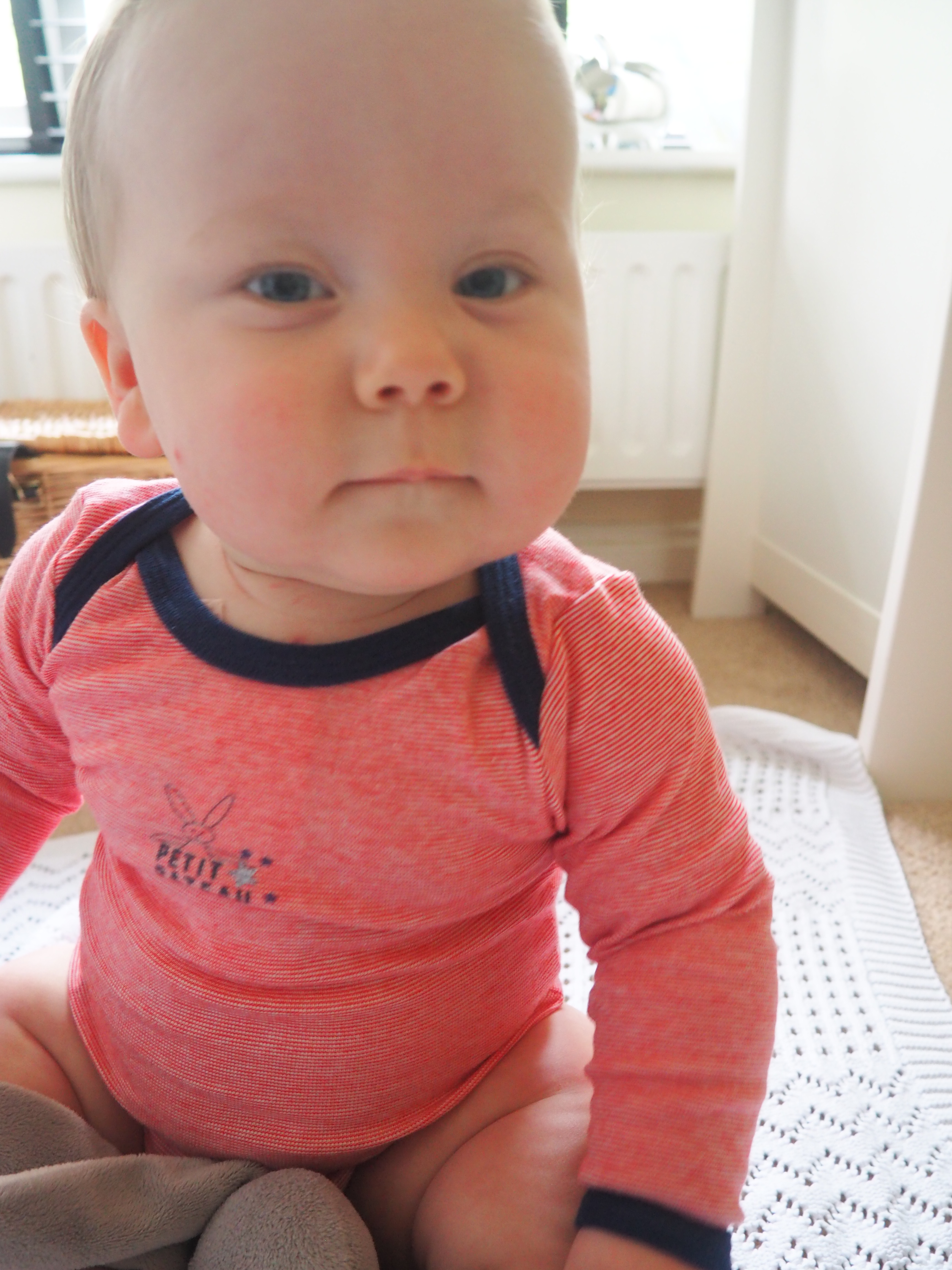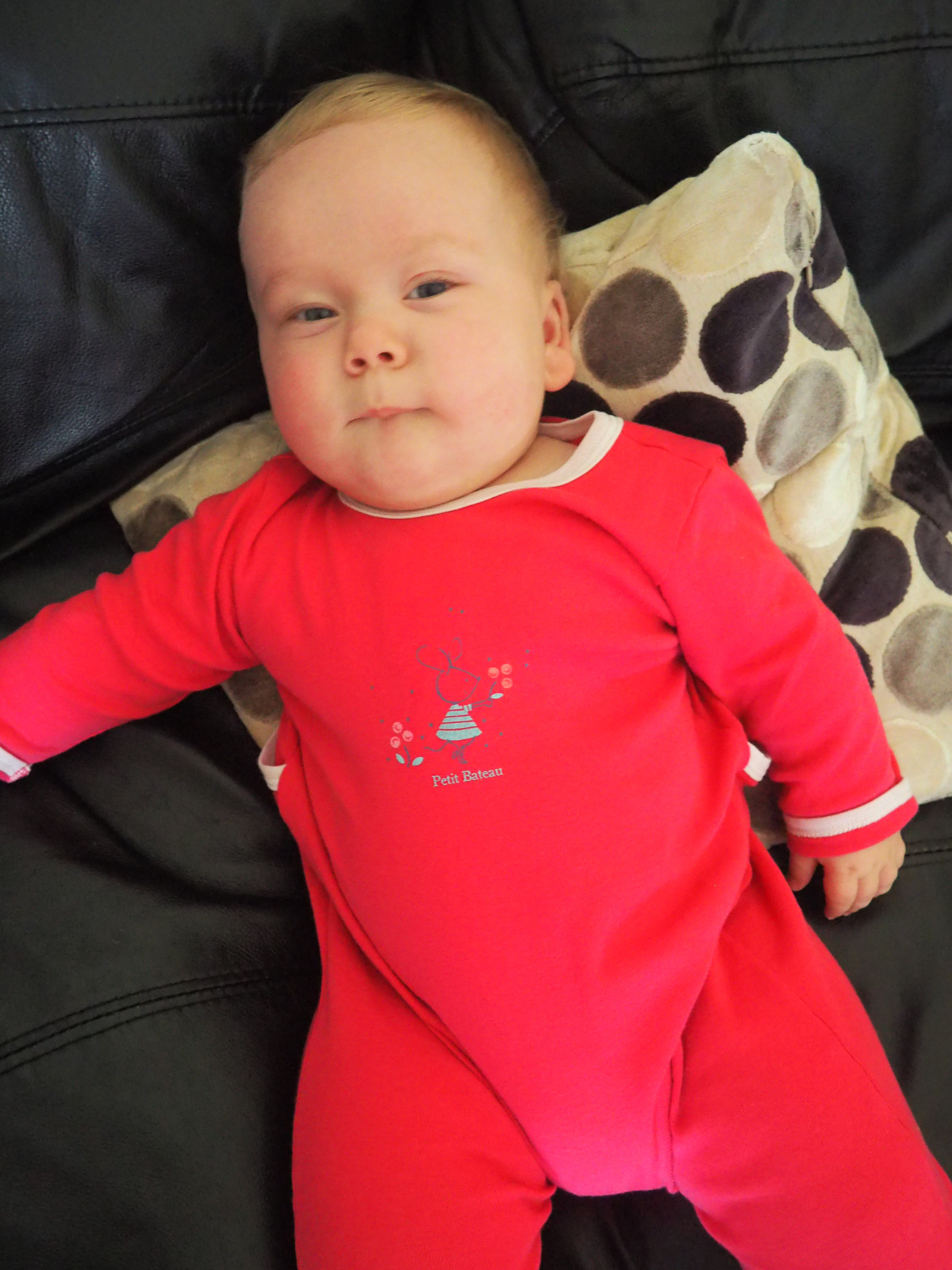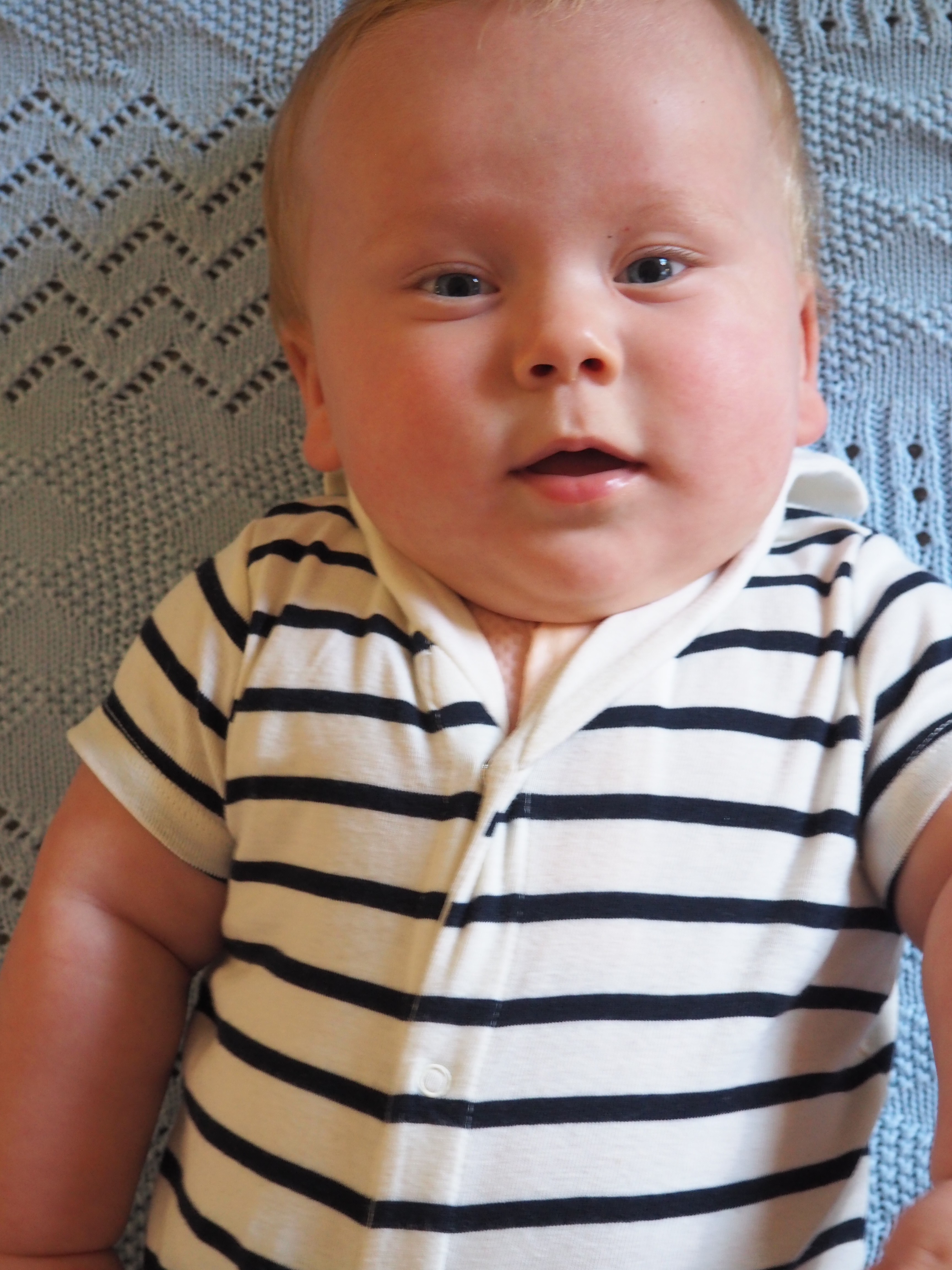 The bright colour suits very well Baba’s blue eyes. And the motif on it is also gorgeous! In cotton, it is both comfortable pour bébé and easy-care pour Maman! Don’t neglect this kind of details. You want something easy to wash!