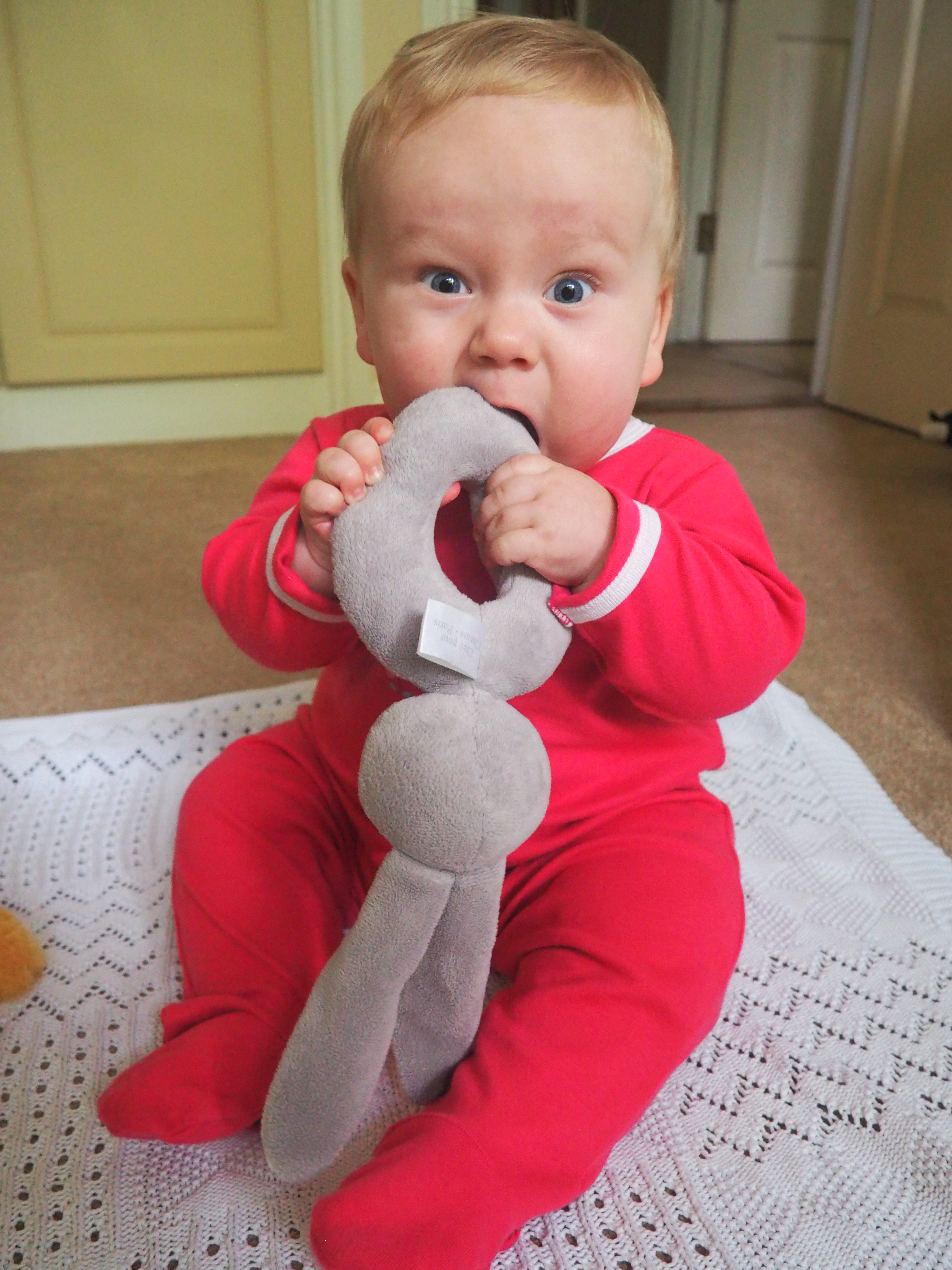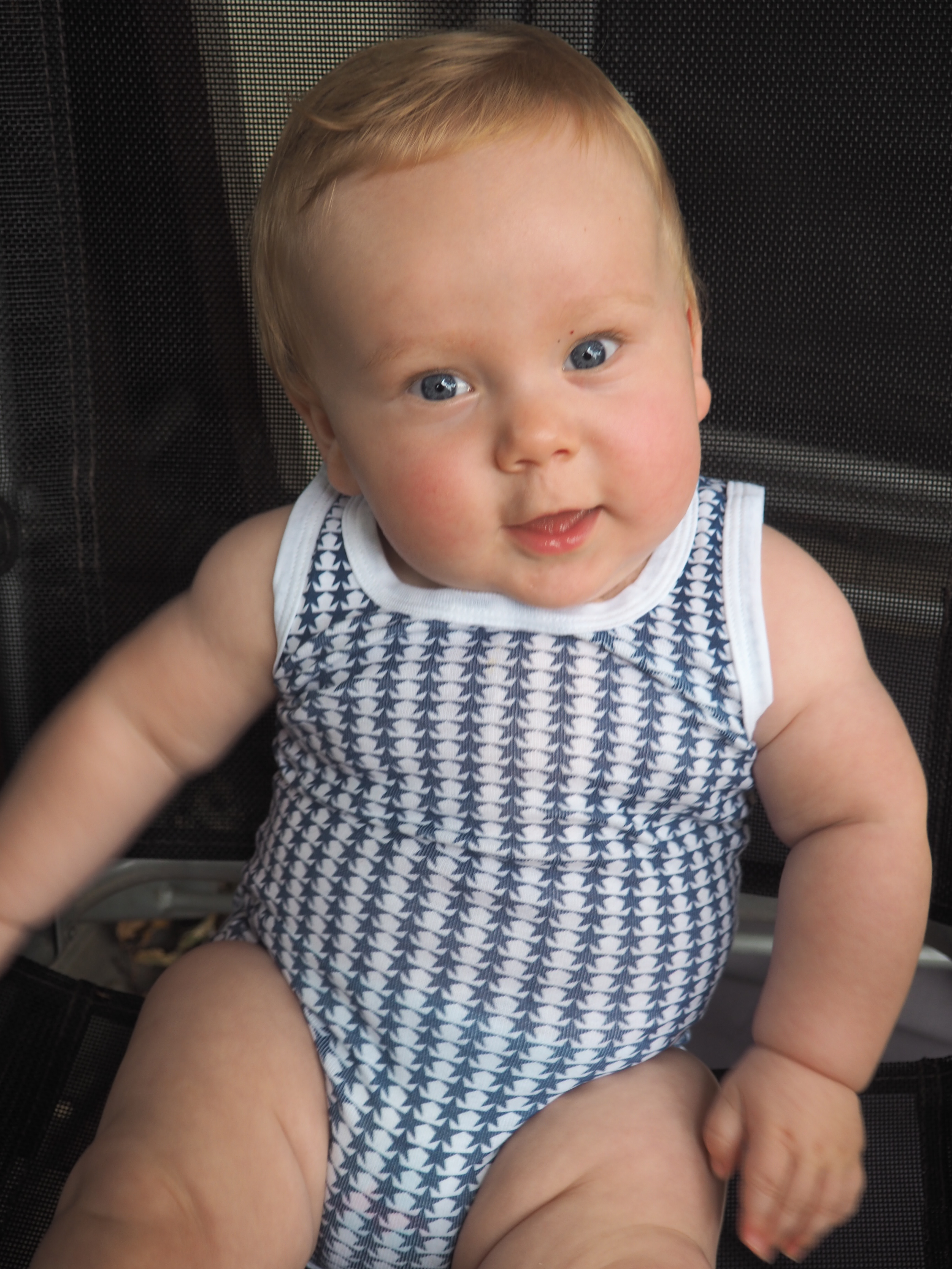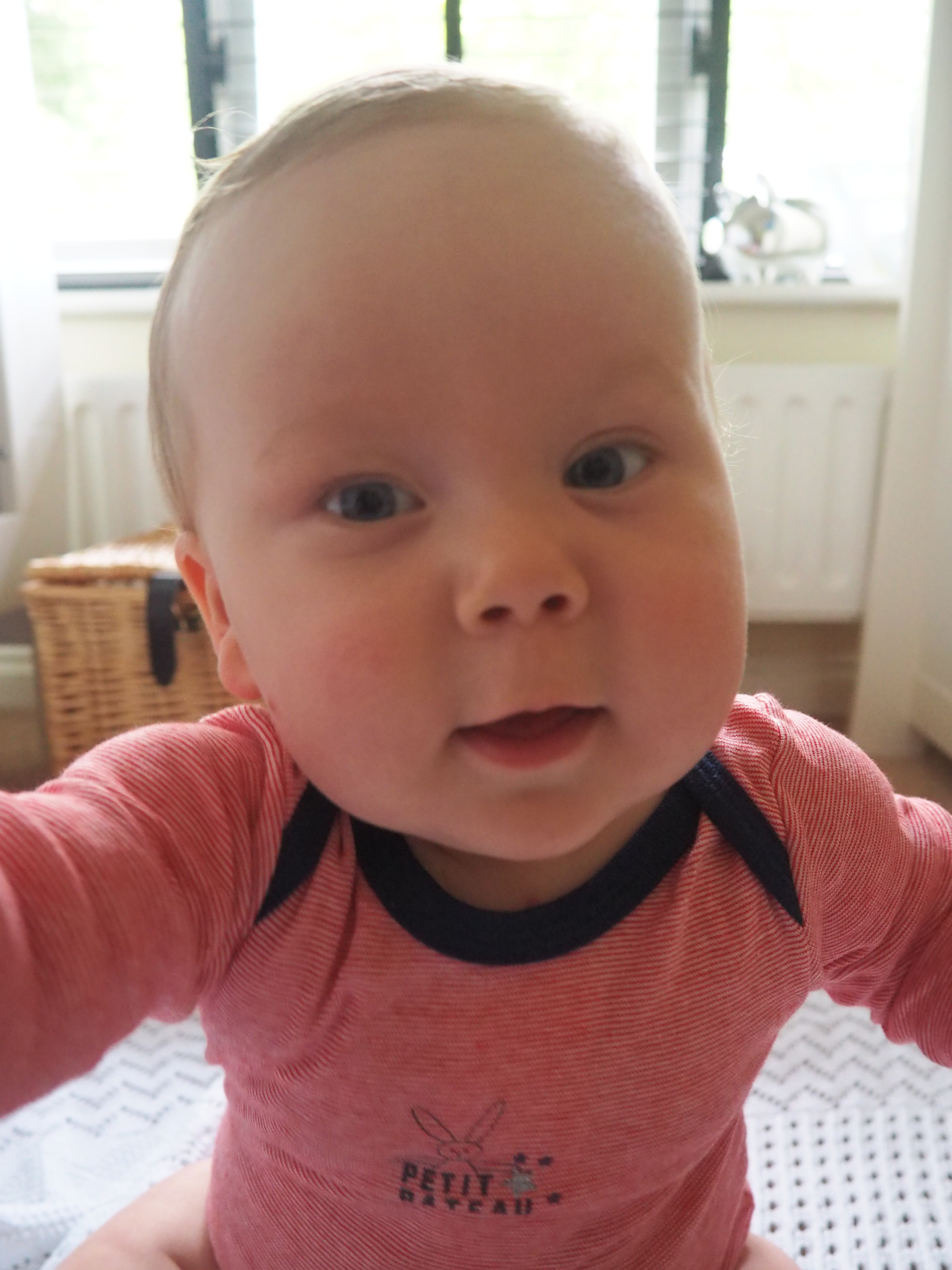 The bright colour suits very well Baba’s blue eyes. And the motif on it is also gorgeous! In cotton, it is both comfortable pour bébé and easy-care pour Maman! Don’t neglect this kind of details. You want something easy to wash!